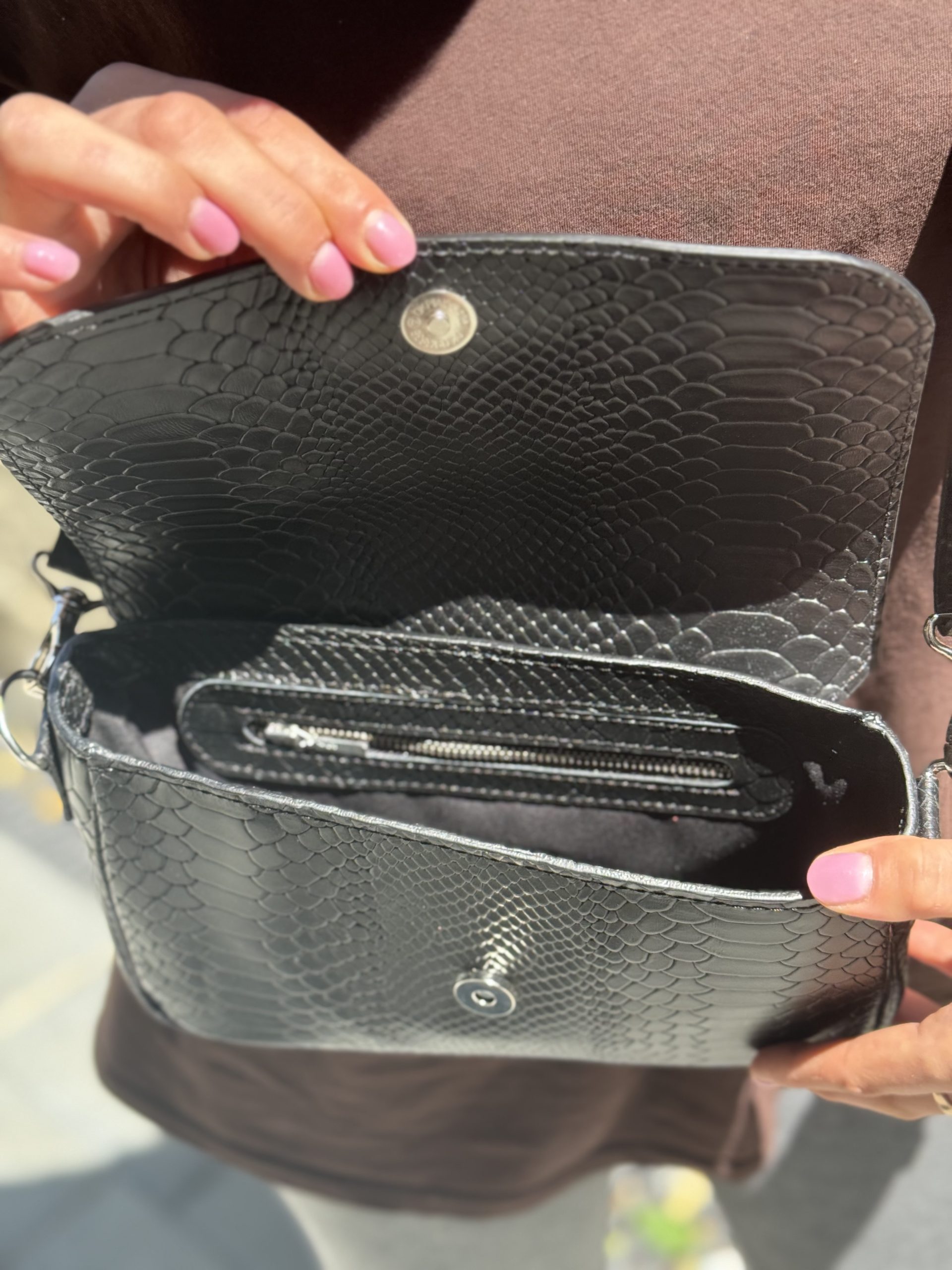 • Dimensiuni: ideale pentru telefon, portofel și obiecte mici